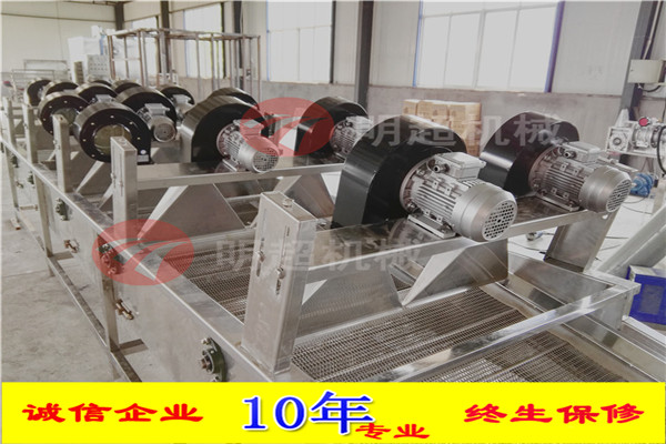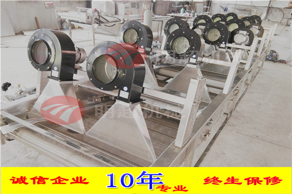 6.通過風(fēng)刀將自然風(fēng)轉(zhuǎn)換成強(qiáng)流風(fēng)。風(fēng)干機(jī)輸送網(wǎng)帶設(shè)計為多次翻轉(zhuǎn)輸送,確保產(chǎn)品兩面除水效果,風(fēng)干機(jī)吹干效果良好 設(shè)備采用變頻輸送,速度可調(diào)輸送平穩(wěn)。