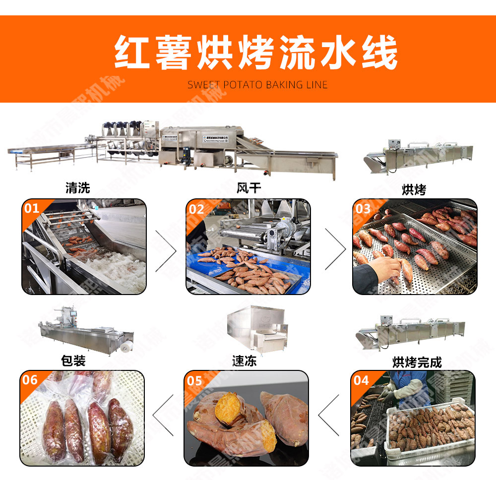 烤紅薯設備需要設備有:首先需要紅薯清洗機,紅薯上料機,紅薯烘烤線,紅薯冷卻機等組成