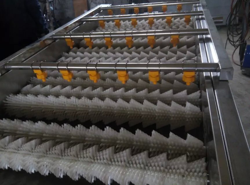 毛刷清洗機是通過毛輥的轉動,把水果上面的泥土清洗干凈,不損害表皮,使水果表面光潔如新。例如:草莓、梨、桃、土豆、枸杞等球狀的水果。